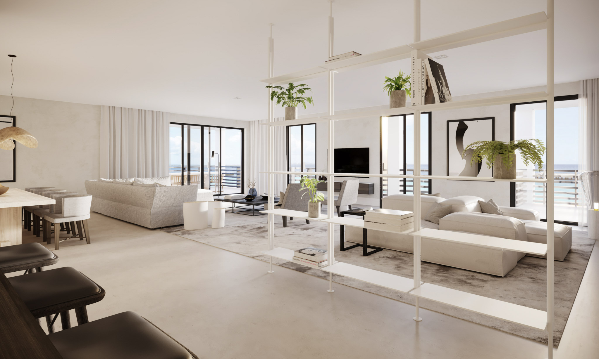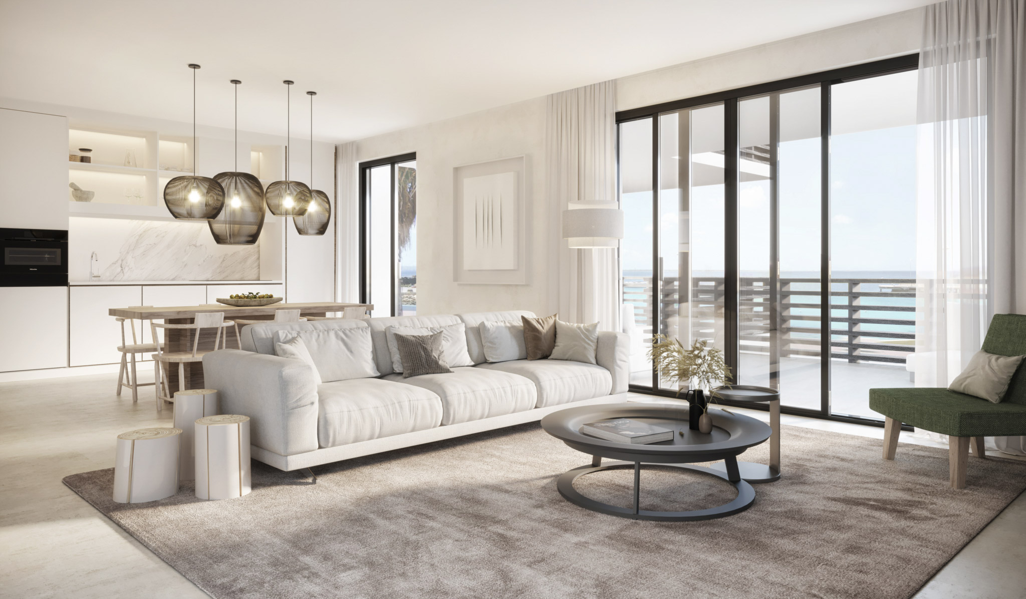 De appartementen ademen luxe en comfort en zijn van alle gemakken voorzien. Het gevoel van hagelwitte stranden, zonsondergangen en azuurblauwe zee hebben we terug laten komen in de verschillende appartementen. De basis van het ontwerp is licht, wit en fris. We hebben gewerkt met natuurlijke materialen en texturen die het eiland vertegenwoordigen. De donkere kozijnen zorgen voor een evenwichtig contrast. Door de materiaalkeuze zijn natuurlijke overgangen gecreëerd.