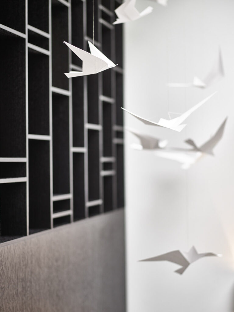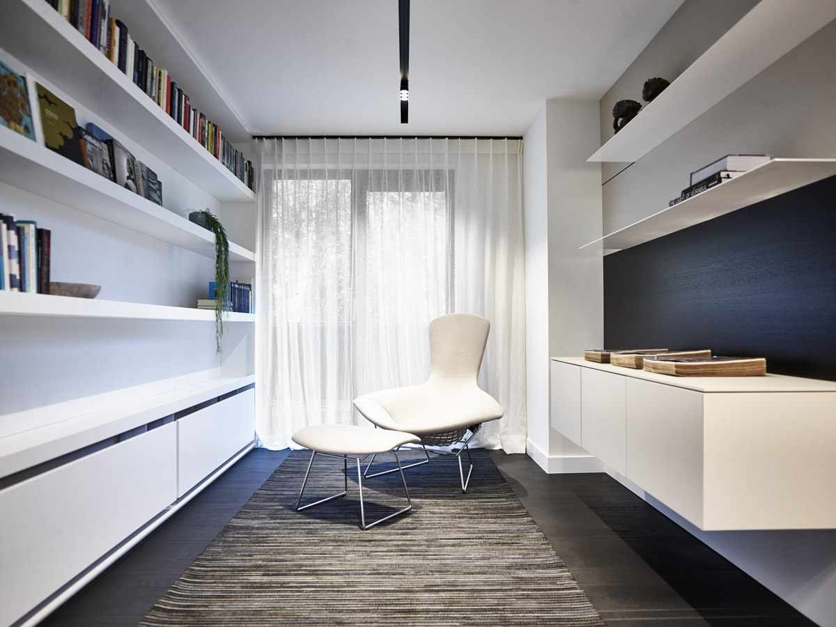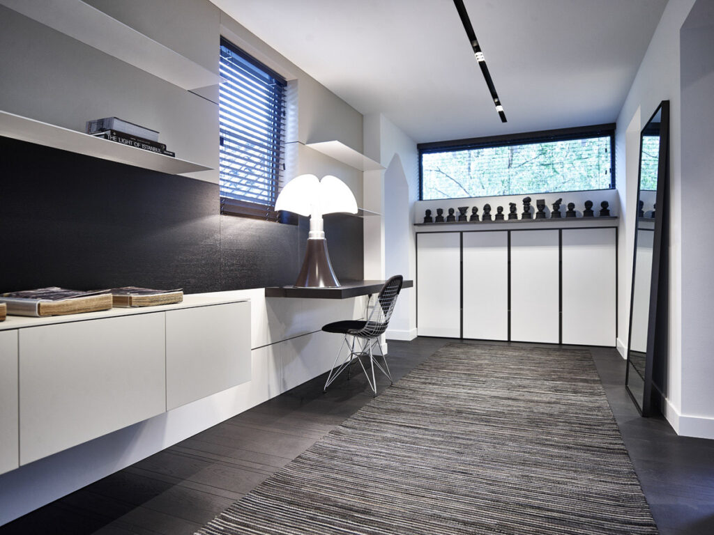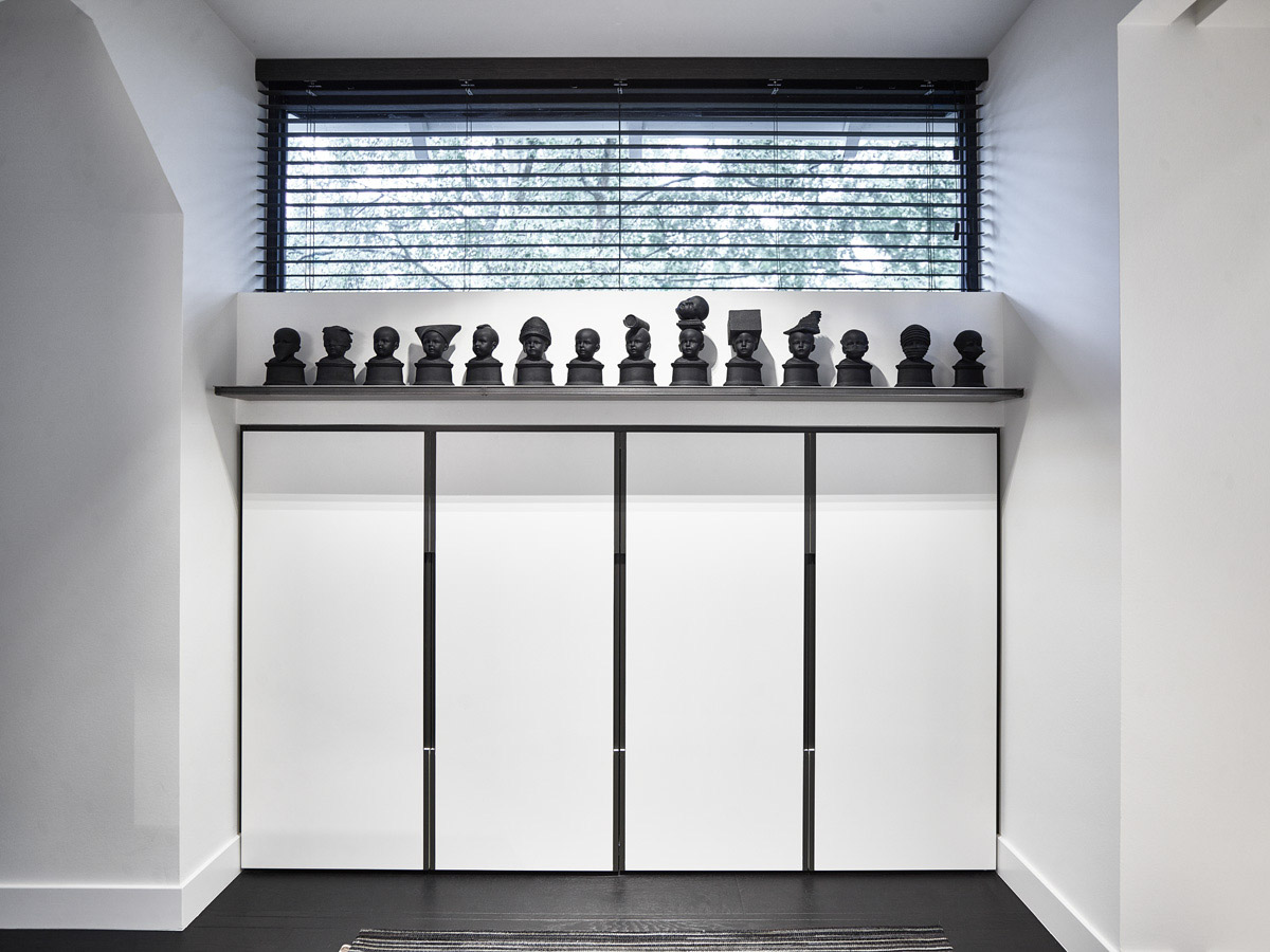 Een ingetogen kleurstelling en materiaalgebruik zorgt voor een rustige basis voor alle kunst.