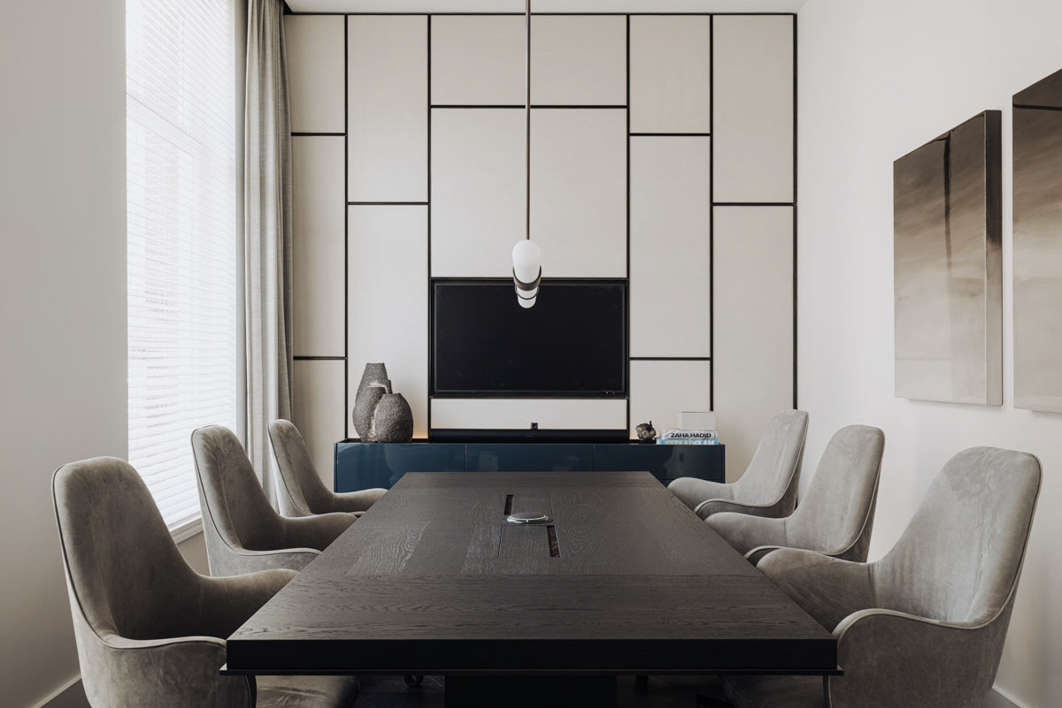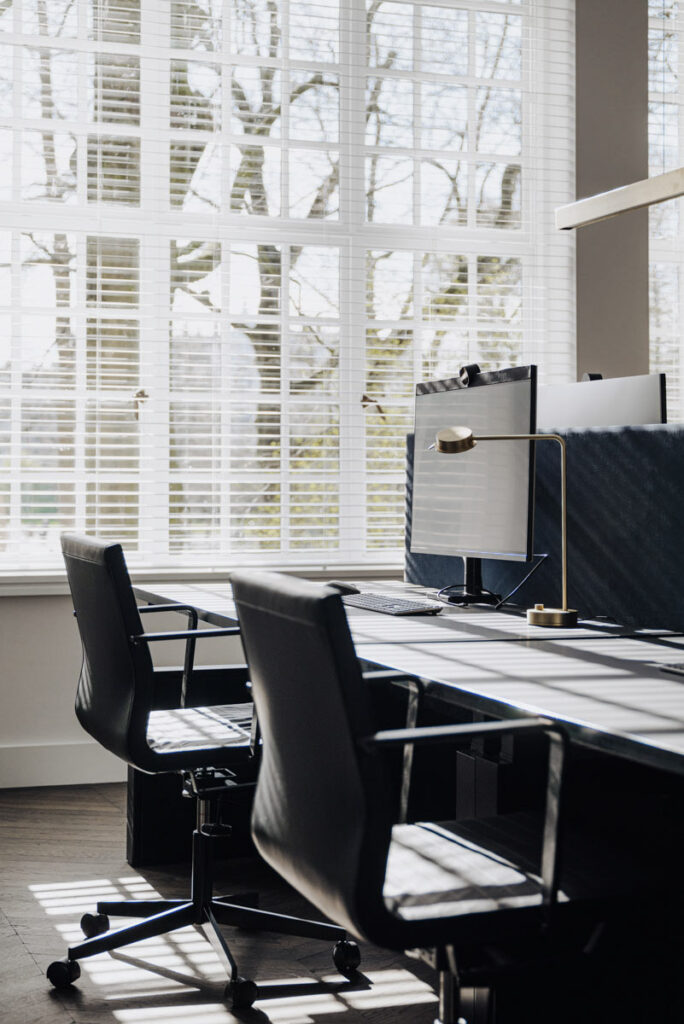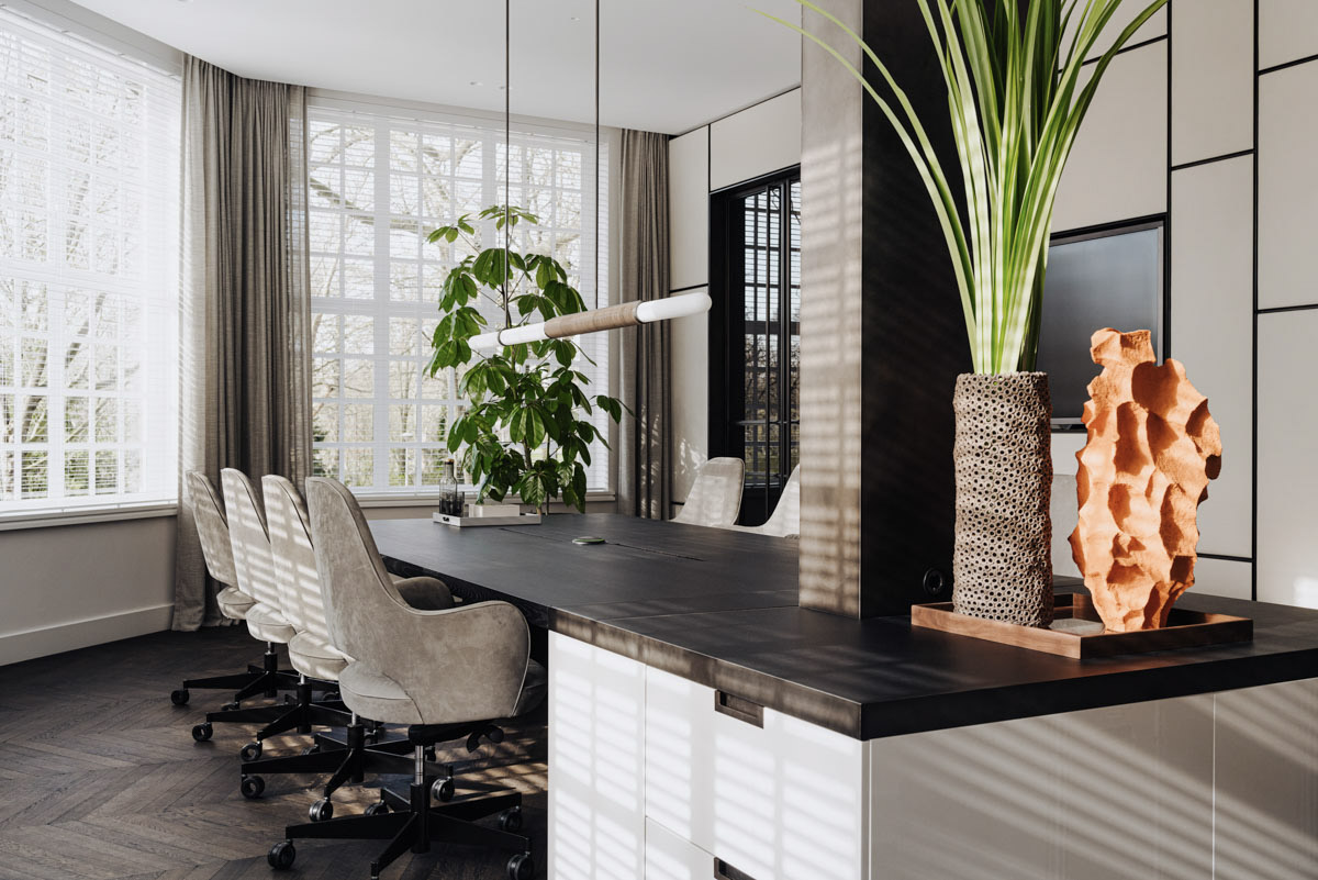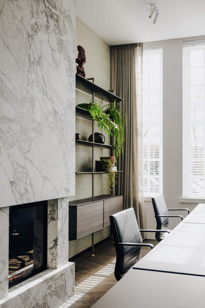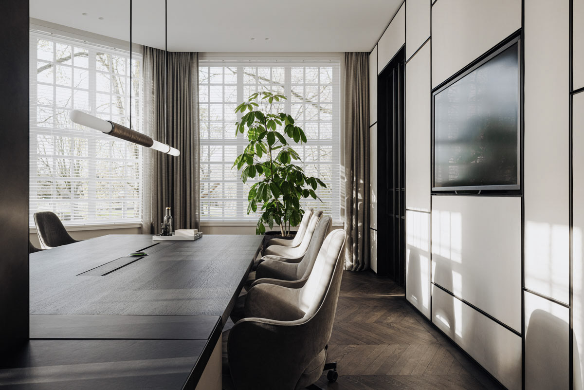 Deze family office vind je aan de rand van het bruisende Vondelpark in hartje Amsterdam. Zodra de deur achter je dicht valt voel je echter de rust van het interieur. In dit kantoor hebben we de details uitgelicht. Zo zijn er kaders om de geschuurde leren panelen en is er gewerkt met diep geborsteld fineer.
