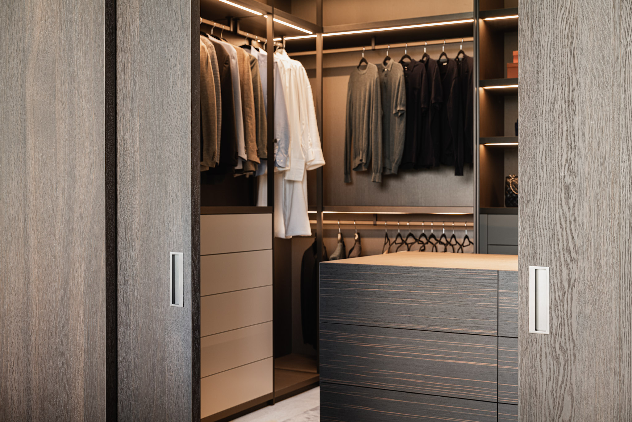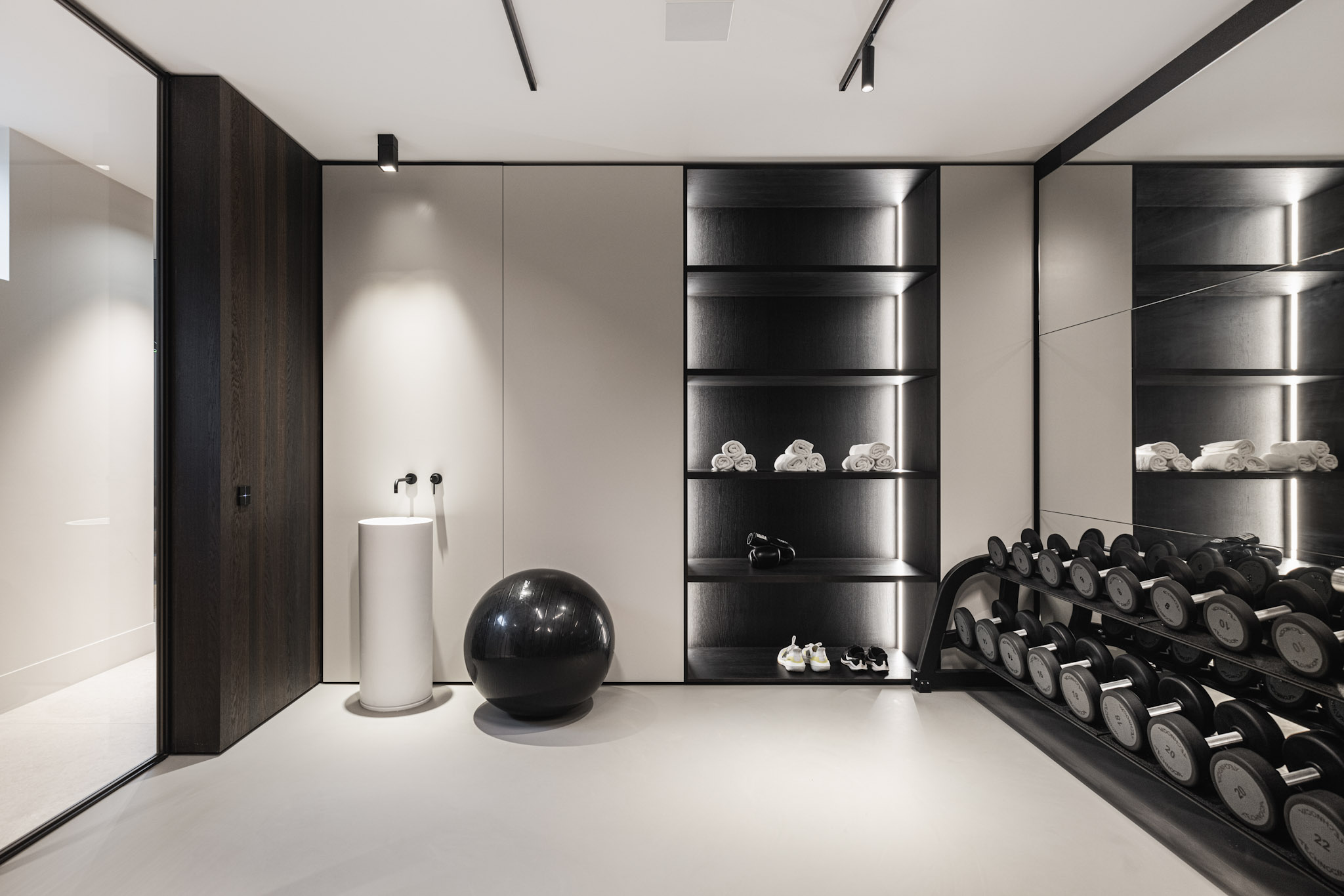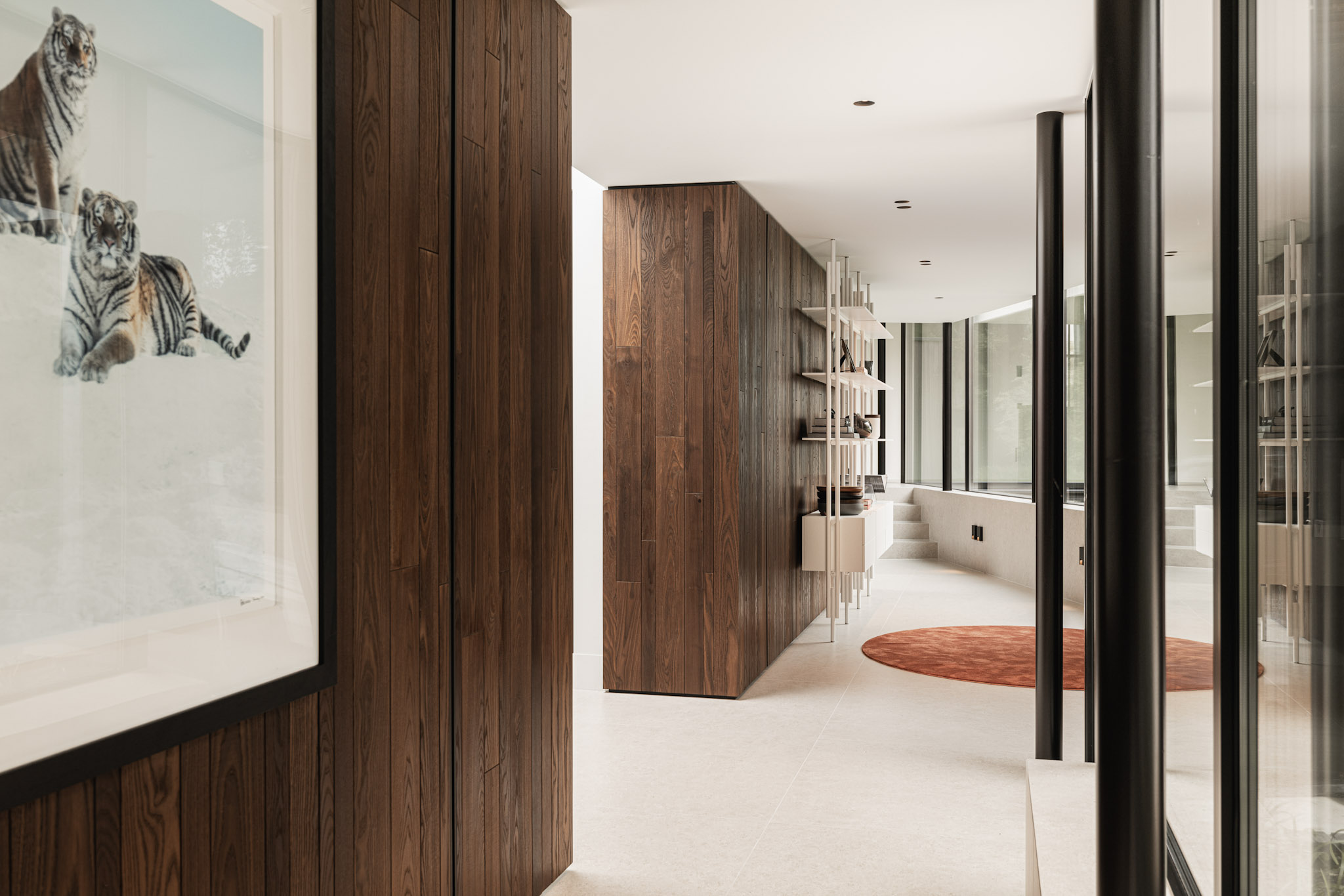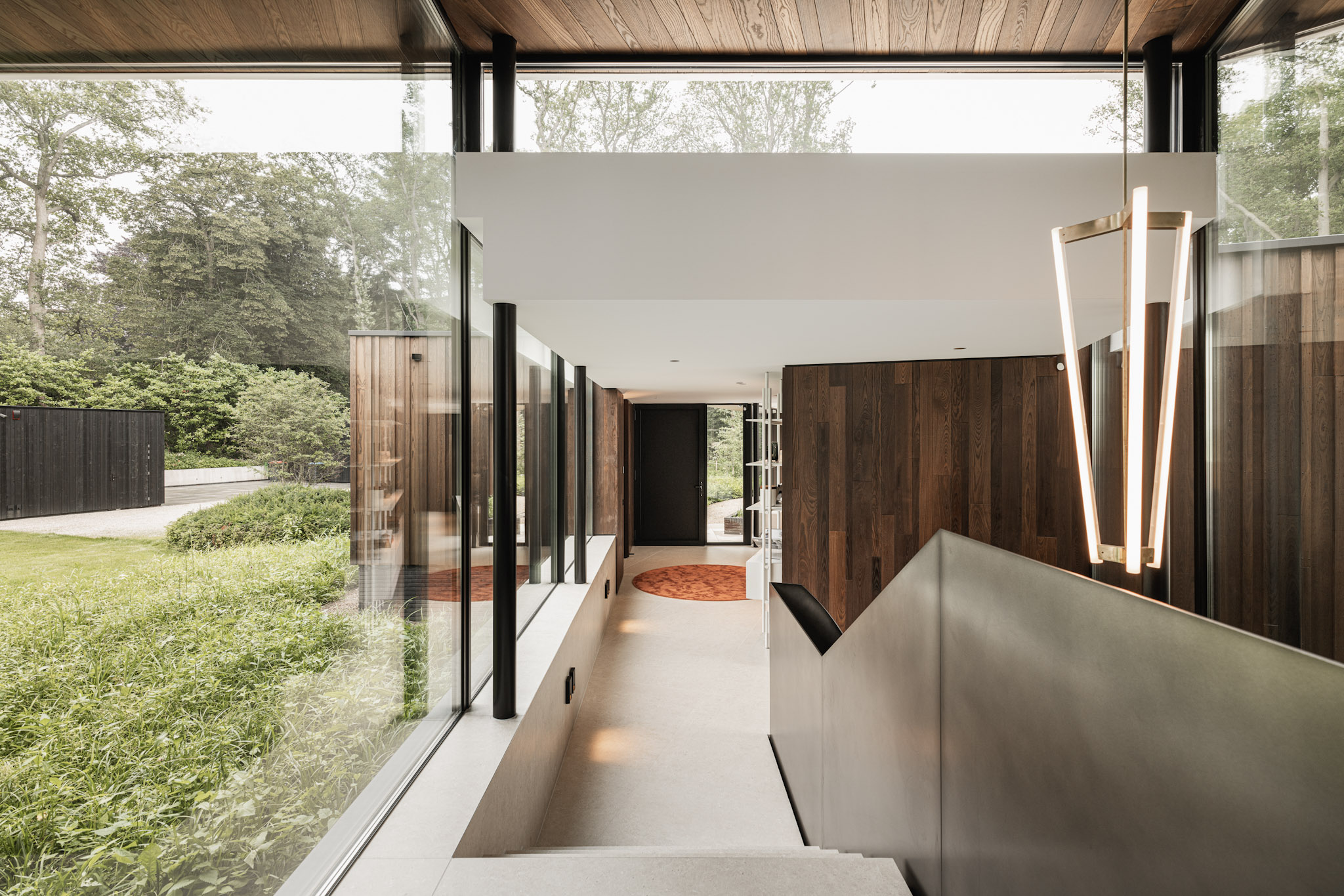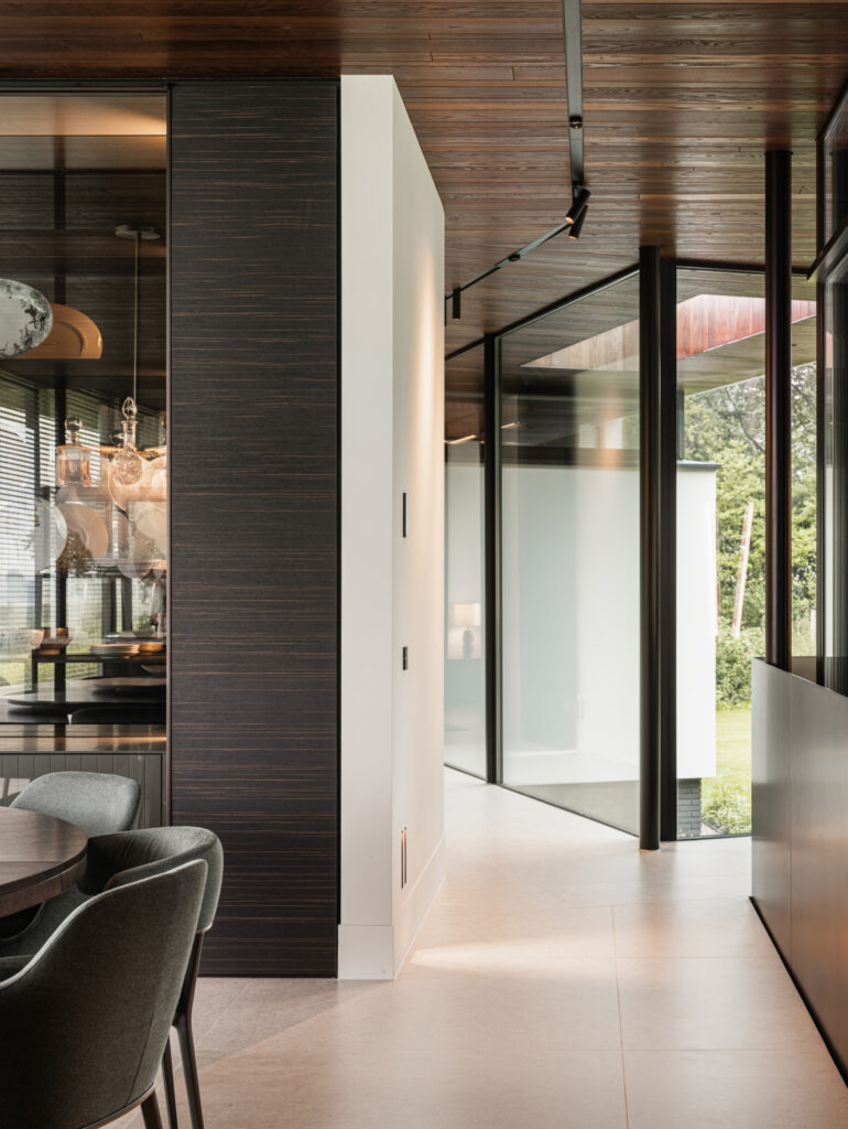 De warme bruine tint van het essen zorgt voor geborgenheid. Een mooi contrast met de glazen puien en de harde vloer, bestaande uit grote tegels. Deze vloer ligt op de gehele benedenverdieping en loopt door over de terrassen en de trap naar het souterrain.