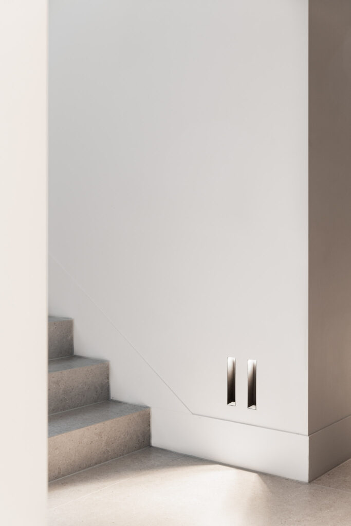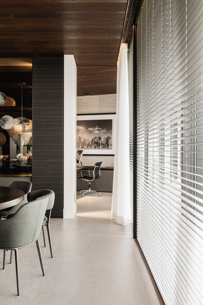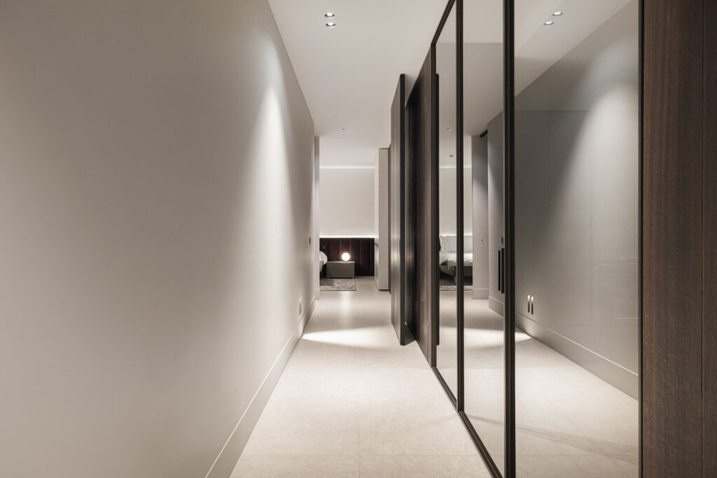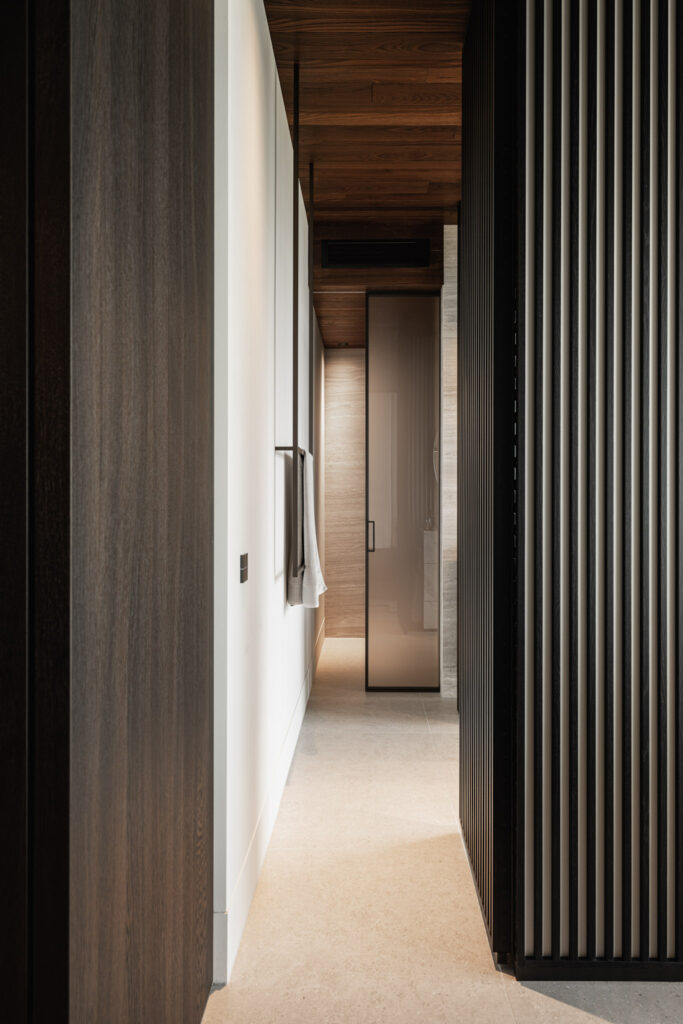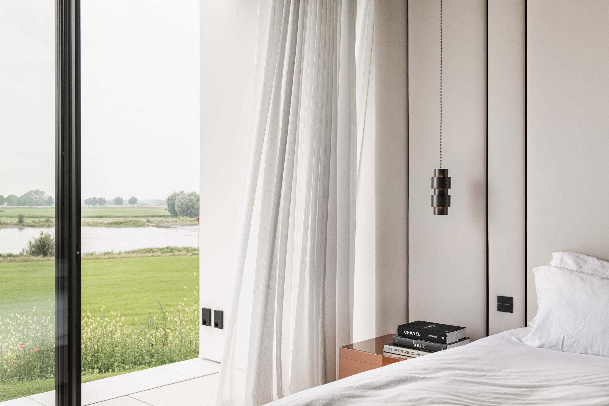 Het hoger gelegen deel van het huis aan de achterzijde heeft zo’n 30 meter glazen pui waardoor je een panoramisch uitzicht hebt over de rivier. Het interieur sluit aan op de heldere architectonische lijnen, hier en daar wordt het lijnenspel geaccentueerd. Zo is er een 23 meter lange verlichtingsarmatuur, die vanuit de woonkamer doorloopt tot aan de master bedroom.