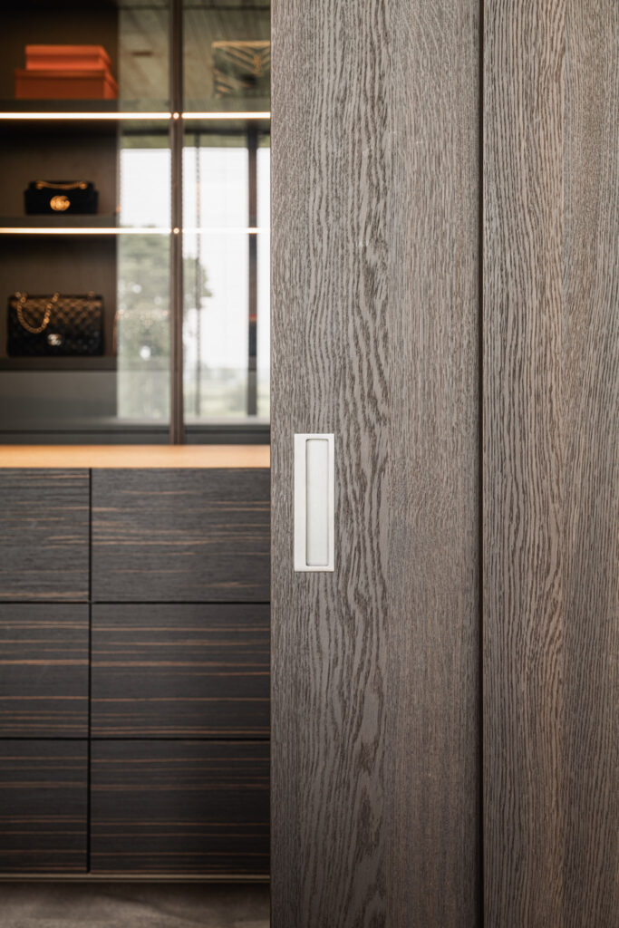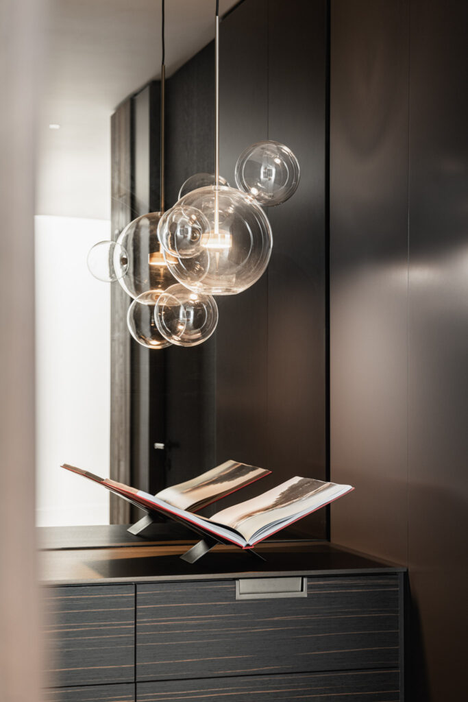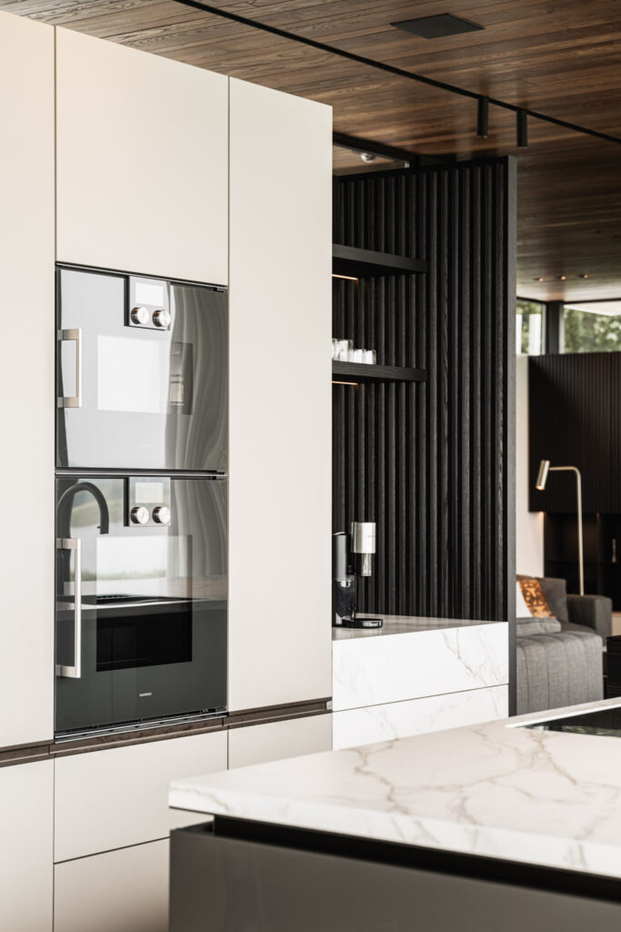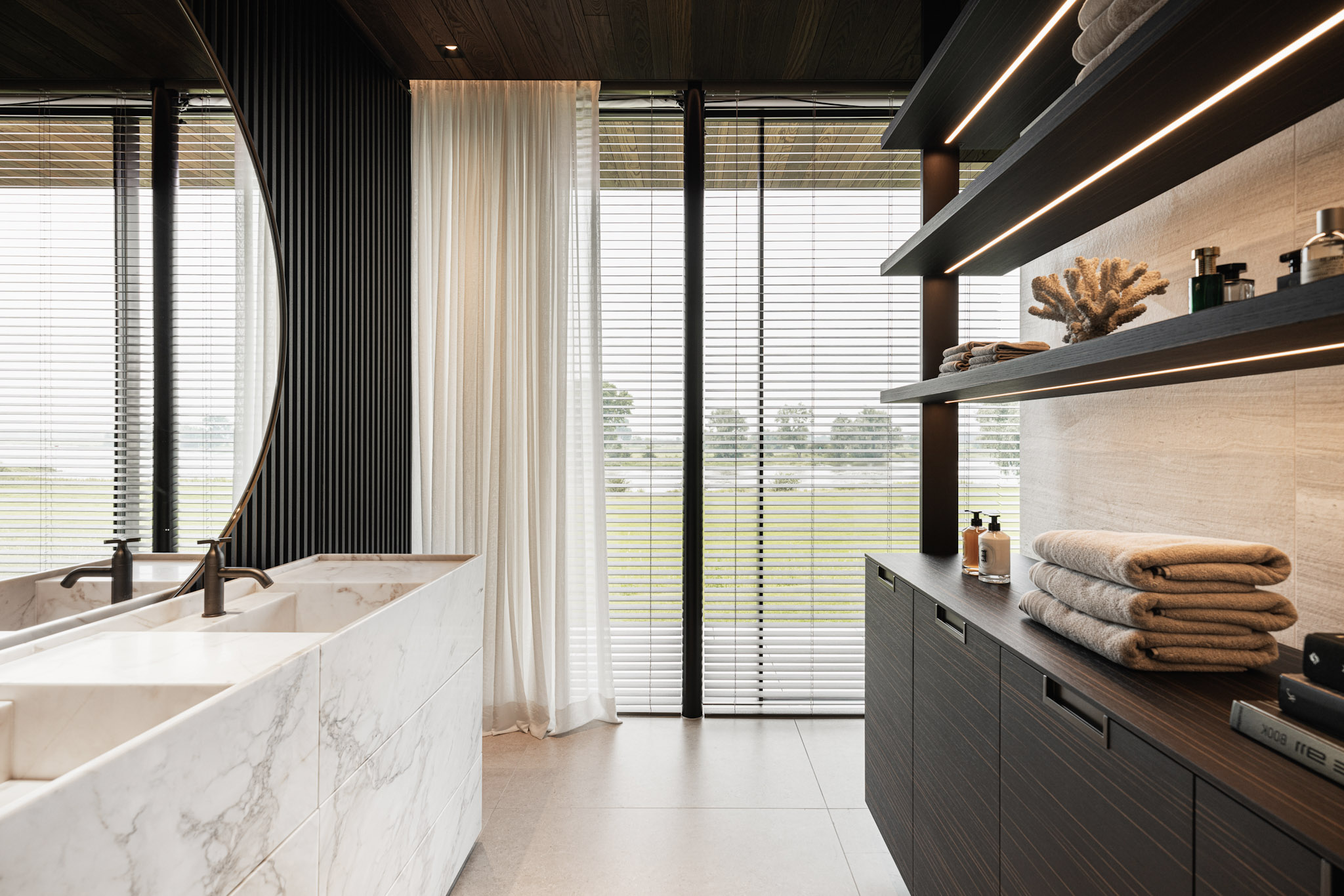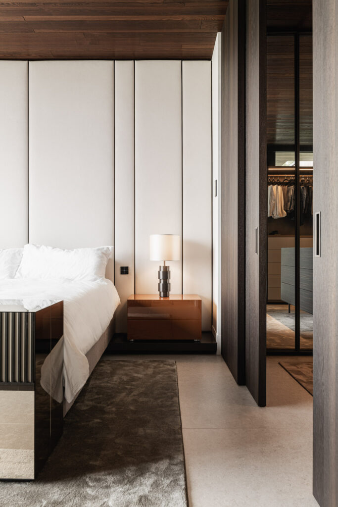 Het hoger gelegen deel van het huis aan de achterzijde heeft zo’n 30 meter glazen pui waardoor je een panoramisch uitzicht hebt over de rivier. Het interieur sluit aan op de heldere architectonische lijnen, hier en daar wordt het lijnenspel geaccentueerd. Zo is er een 23 meter lange verlichtingsarmatuur, die vanuit de woonkamer doorloopt tot aan de master bedroom.