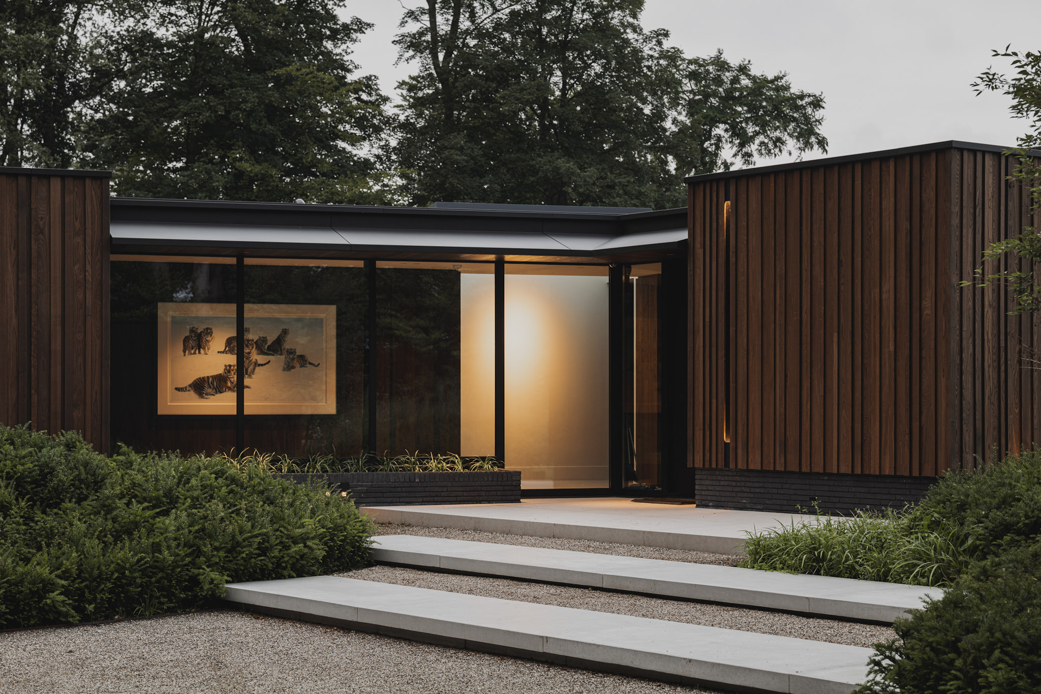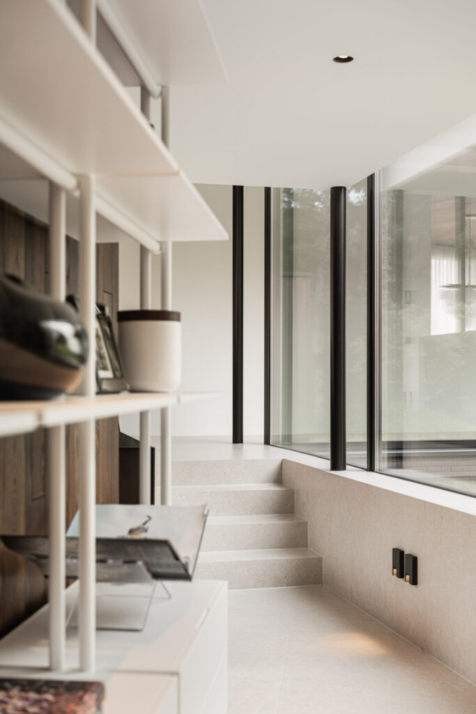 Het huis bestaat uit drie volumes waarvan er één wat lager gelegen is. Dit lager gelegen deel focust zich vooral op de bos zijde van het perceel. Er is hier veel privacy gecreëerd om zo in rust te kunnen genieten aan het zwembad en op het terras.