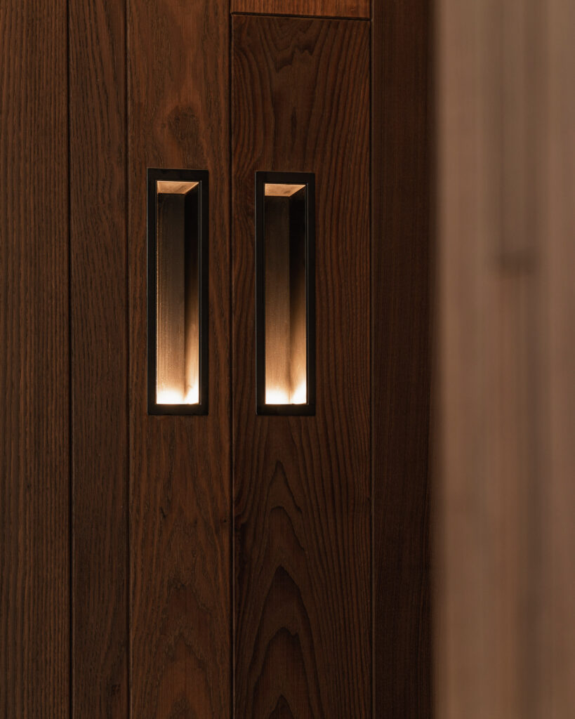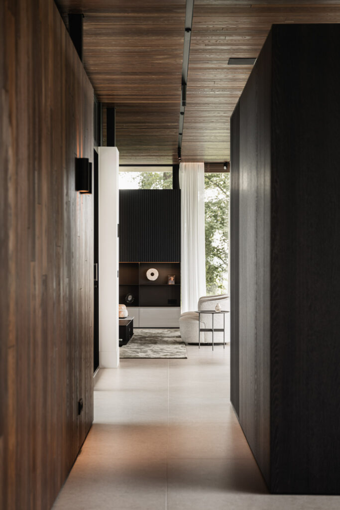 In samenspraak met de architect is er voor gekozen de wanden van deze zijde van de woning te bekleden met gerookt essen gevelbekleding. Geplaatst in verschillende breedtes en diktes wat de speelse onregelmatigheid van de natuur weerspiegelt.