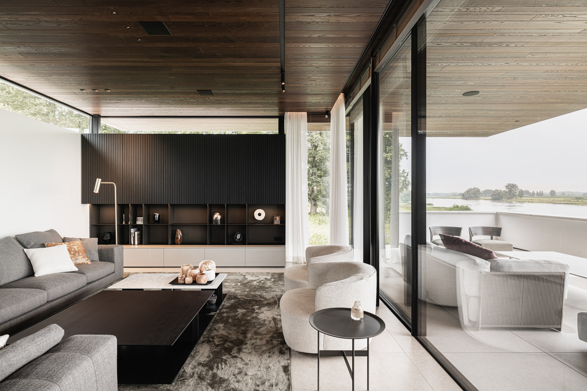 Aan de waterzijde van het landhuis is er volledige openheid om het uitzicht te omarmen.