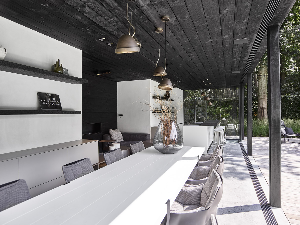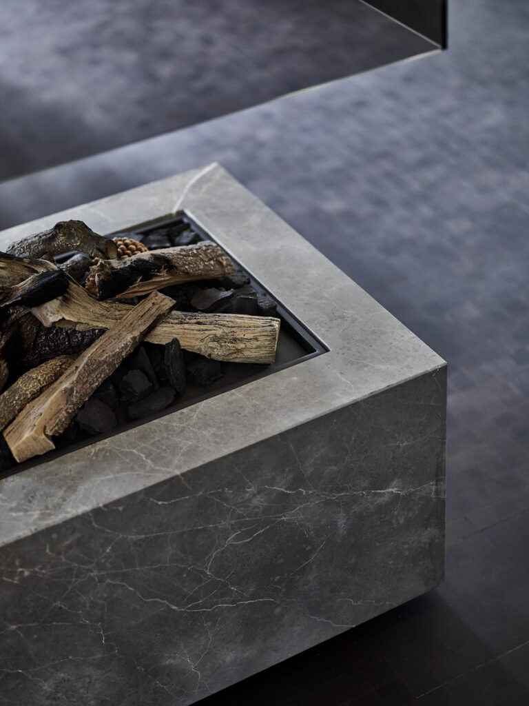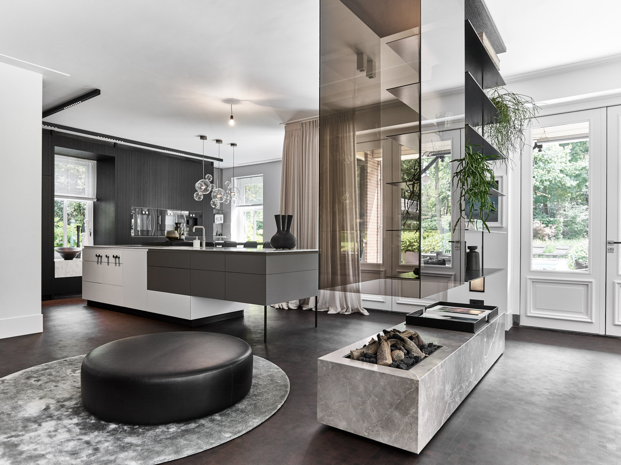 De haard functioneert als afscheiding tussen de keuken en dining. Gemaakt van een massief blok natuursteen, naadloos in verstek gezaagd. Dit is de solide basis. Met de glazen kap en hangende kast blijft het ruimtelijke gevoel behouden. Strak maar nonchalant.
