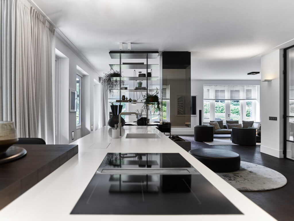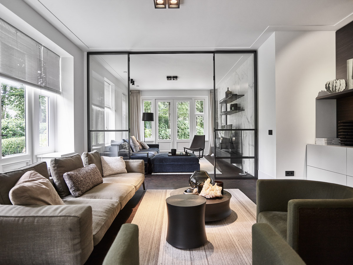 De wens was de ruimtes zo in te delen, dat er met zijn allen maar ook apart geleefd kan worden. De living heeft daarom meerdere sits. Deze kunnen worden gescheiden door de stalen schuifwanden. Omdat dit een transparante wand is, blijft de ruimtelijkheid behouden en is er geen harde afscheiding.
