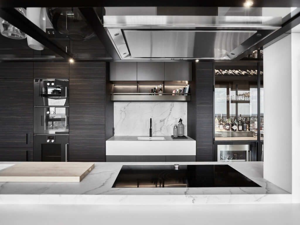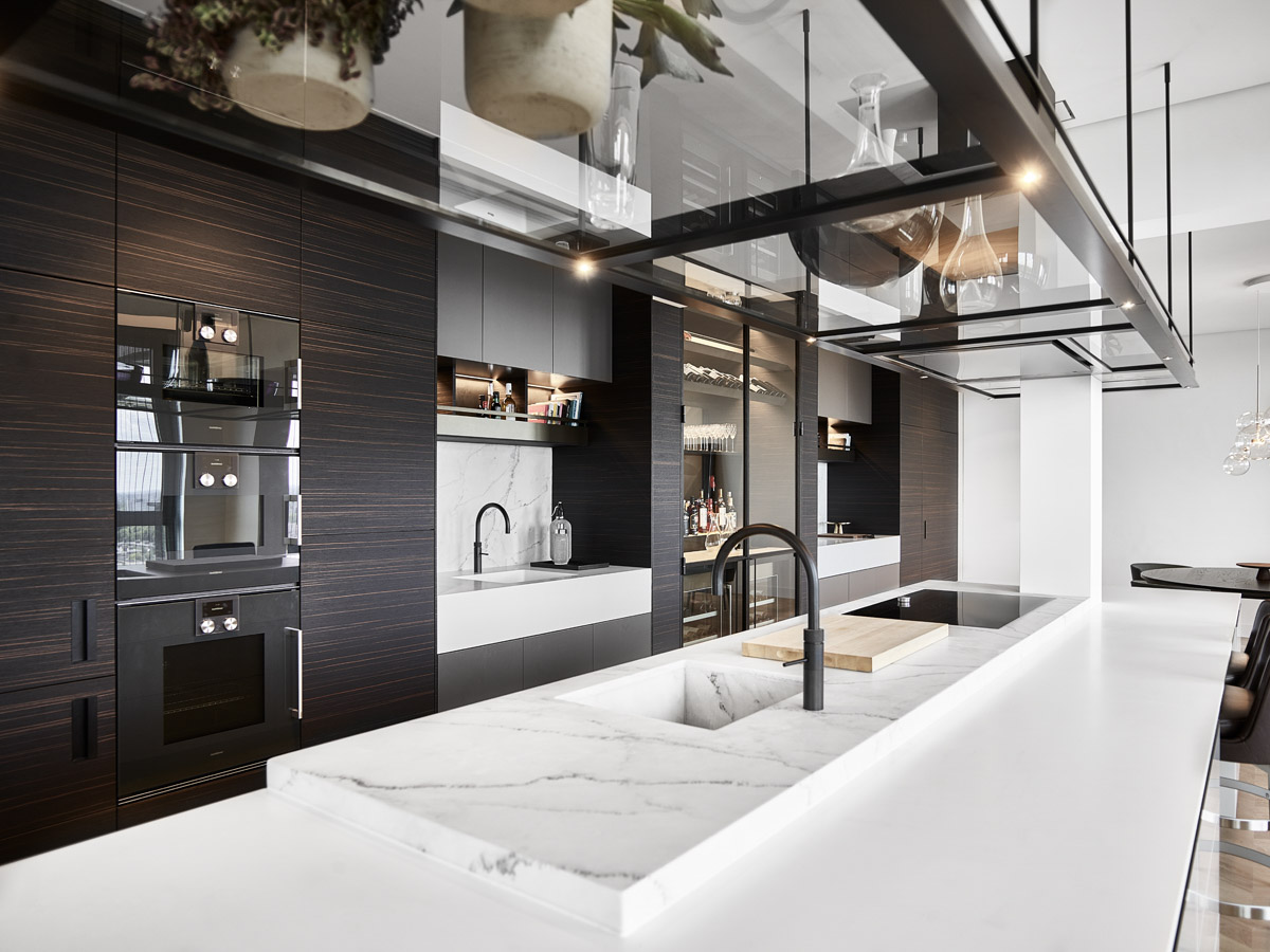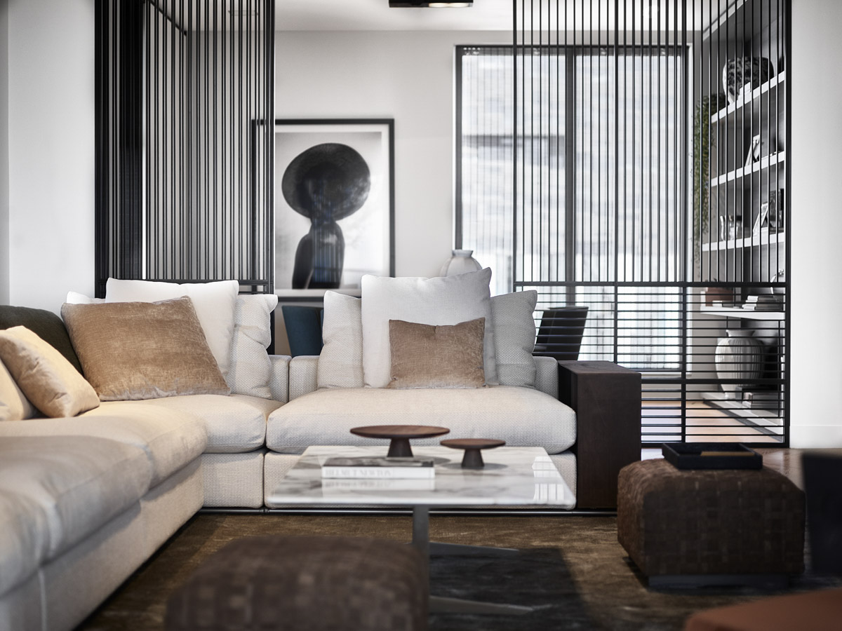 In het ontwerp voor het meer dan 200 m2 grote appartement is een volledig nieuwe indeling gemaakt. Met veel licht, mooie zichtlijnen en spannende doorzichten. De 3,5 meter hoge muren, het adembenemende uitzicht en de inspirerende hectiek van de Zuidas maken dit appartement compleet.
